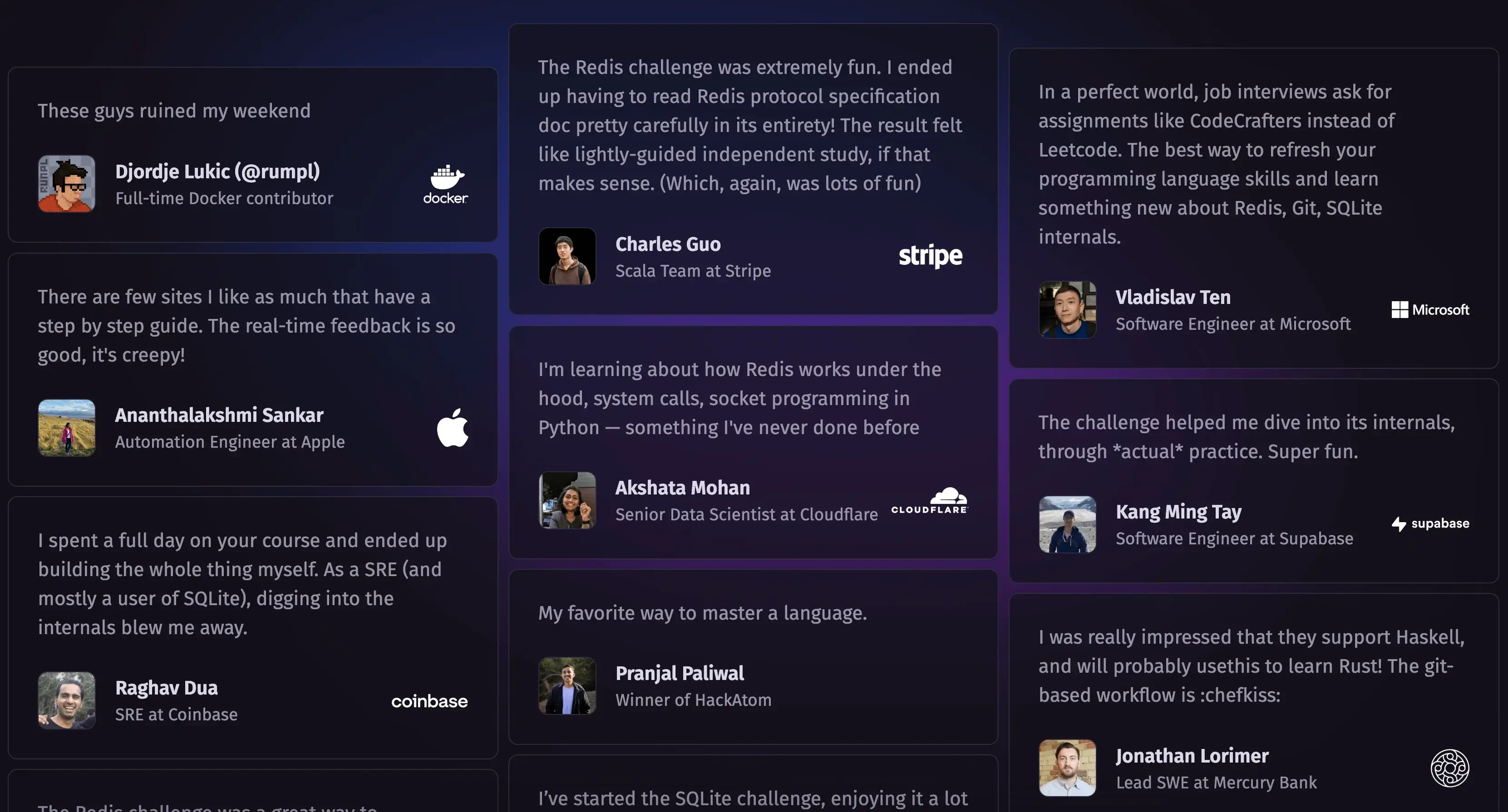 CodeCrafters projects take developers on an adventure to do the kind of programming that makes them remember why they fell in love with the craft.